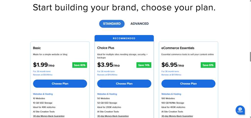 1.Head to Bluehost: Click here to visit Bluehost and select the “Get Started” button. You’ll be presented with various hosting packages. For beginners, the basic package is often sufficient, offering all the essentials. You can always upgrade later as your blog grows.