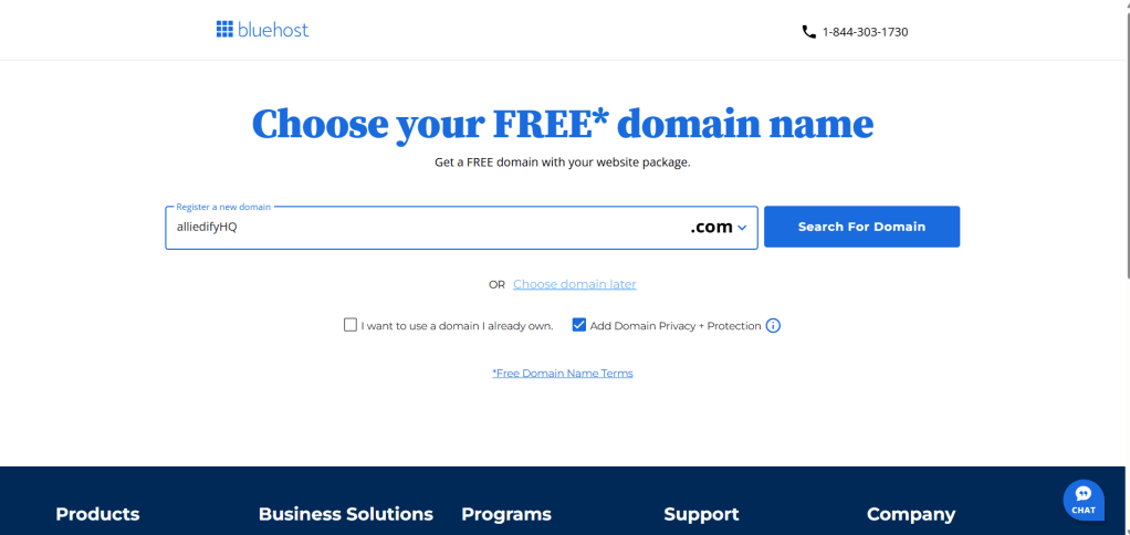 2.Choose Your Domain: This is your blog’s identity. Select a name that’s short, memorable, and relevant to your niche. Bluehost provides a free domain for your first year. If your preferred name isn’t available, try variations or choose to select it later.