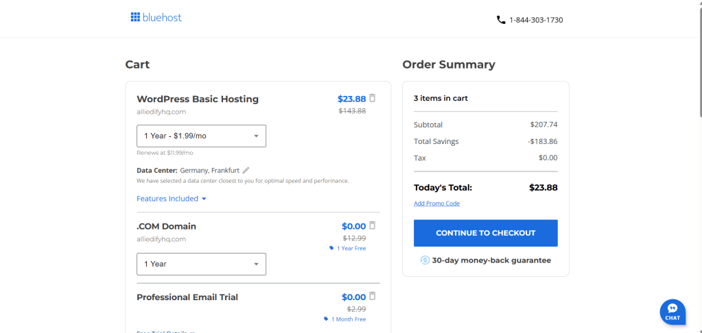 3.Complete Your Purchase: Bluehost offers flexible payment terms, typically 12 or 36 months upfront. Opting for a longer term often reduces your monthly cost. For instance, a 1-year upfront payment can bring your yearly expenses down significantly. Be mindful of pre-selected add-ons.