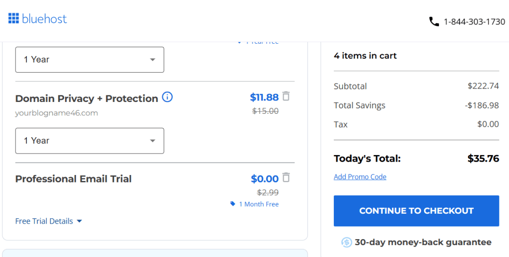 While “Domain Privacy Protection” is recommended (it keeps your personal information private in public domain registries), other options might not be necessary for a new blogger. Uncheck anything you don’t need to keep costs low.