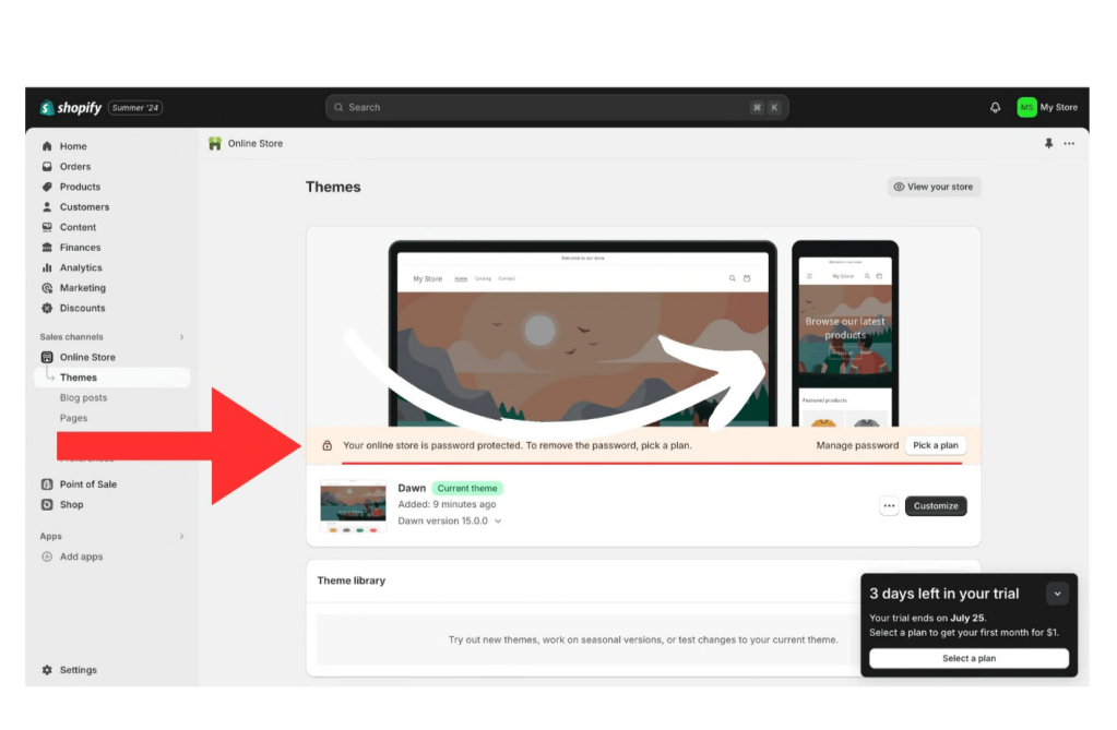 Selecting a plan is crucial because without it, we won’t be able to modify and customize our store or publish it online. As shown in the photo below, Shopify indicates that if we don’t choose a plan, people will need a password to access the site. This is problematic because it means customers won’t be able to visit the store or purchase our products.