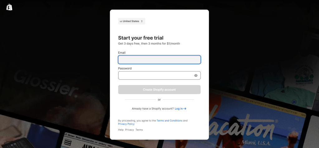 To start selling your products on Shopify, you first need to create an account. Click the link and enter your email if you’re ready to start making money online.Shopify is really convenient. After the free trial, the first month costs only $1, which is less than the price of a coffee. This allows you to set up your store and begin making sales.ATTENTION: From my experience, prices and promotions can change, so I recommend setting up your account for free as soon as possible before prices go up.