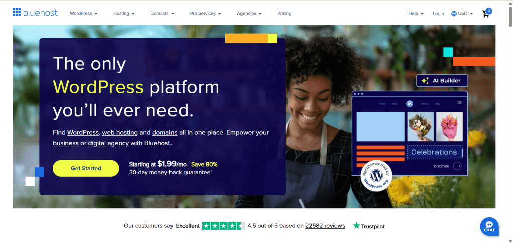 Bluehost is a solid choice if you’re new to web hosting. From 1-click WordPress installs to built-in SSL and free domains, it simplifies the whole process.