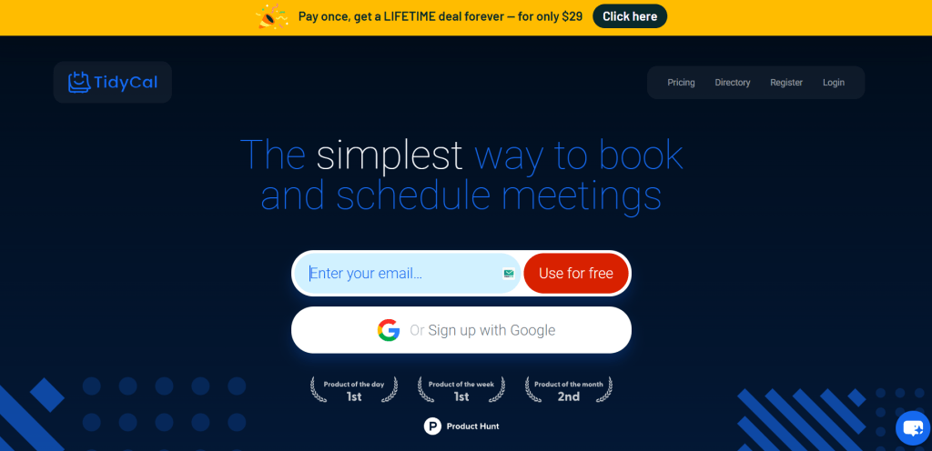 TidyCal offers a lifetime plan starting at just $29—a one-time payment that covers unlimited bookings, integrations, and features. No monthly fees, no subscriptions.