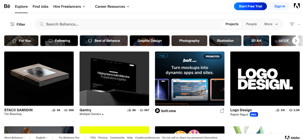 Behance by Adobe is a global showcase platform where designers display their work. While it doesn’t facilitate direct hiring, it’s a powerful way to scout creatives, study portfolios, and reach out directly for freelance collaborations.