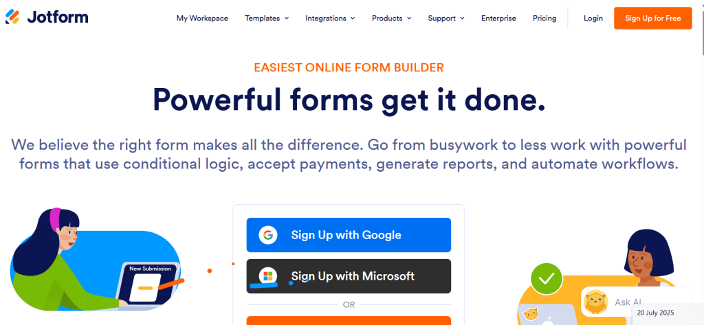 Jotform is a popular online form tool used by over 10 million people. It features an easy drag-and-drop builder, automation tools, and more than 10,000 templates, making it a top alternative to Google Forms.