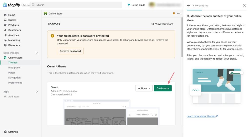 2. Disable password protection (Online Store > Preferences > Remove Password)